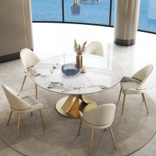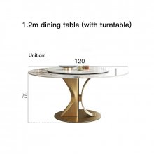 This table shines not only in its fundamental features but also in its ability to enhance the moments that matter. Best used for both daily meals and festive occasions, it turns every gathering into a luxurious banquet. The combination of practicality with the turntable and the unparalleled elegance of the gold stainless steel frame and marble top makes this dining table a unique centerpiece for your home.